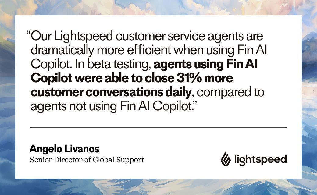 Historically, customer service teams have had to sift through multiple sources and various internal tools – often opening numerous windows and tabs – to find relevant information to resolve customer queries. With Fin AI Copilot, those fragmented searches and inefficiencies will disappear. One of our early testers, Lightspeed, has already seen a 31% increase in agent efficiency with Fin AI Copilot.
