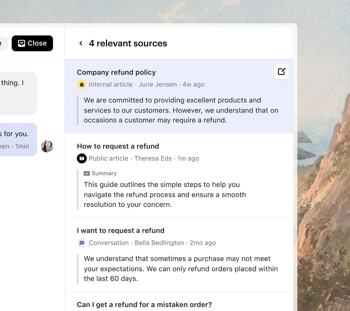With all those sources, it’s more important than ever for an AI system to be transparent about what content it’s referencing when suggesting an answer. That’s why it provides links to the sources which can be previewed directly inside the inbox, so agents can easily cross-reference and validate the answers.