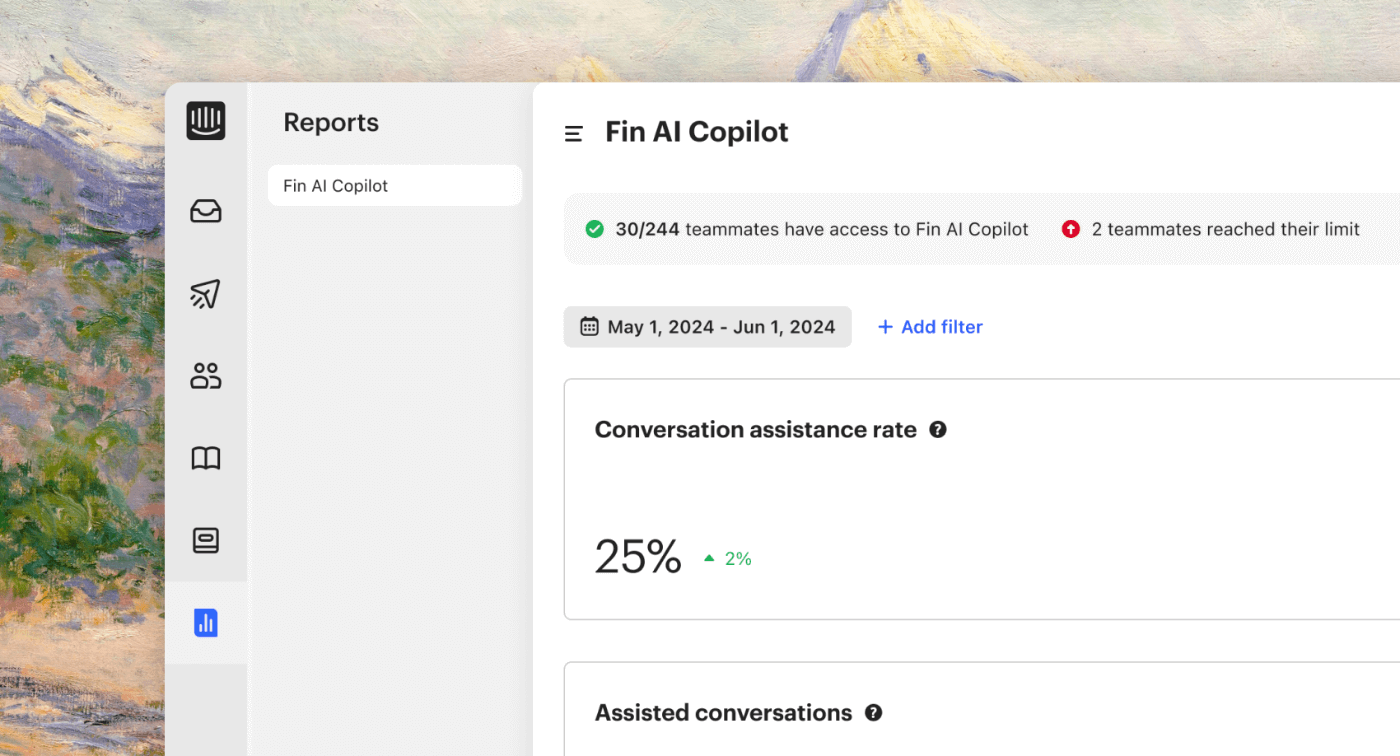 Adapting to this fundamentally new way of doing customer service will require careful monitoring to ensure standards are staying high. You can keep a close watch on how your support teammates are using Fin AI Copilot with a dedicated report. See how many conversations are using Fin AI Copilot, track how many agents are using Fin, and easily review the quality of Fin’s answers. This helps ensure you’re maintaining quality and optimizations at every step.