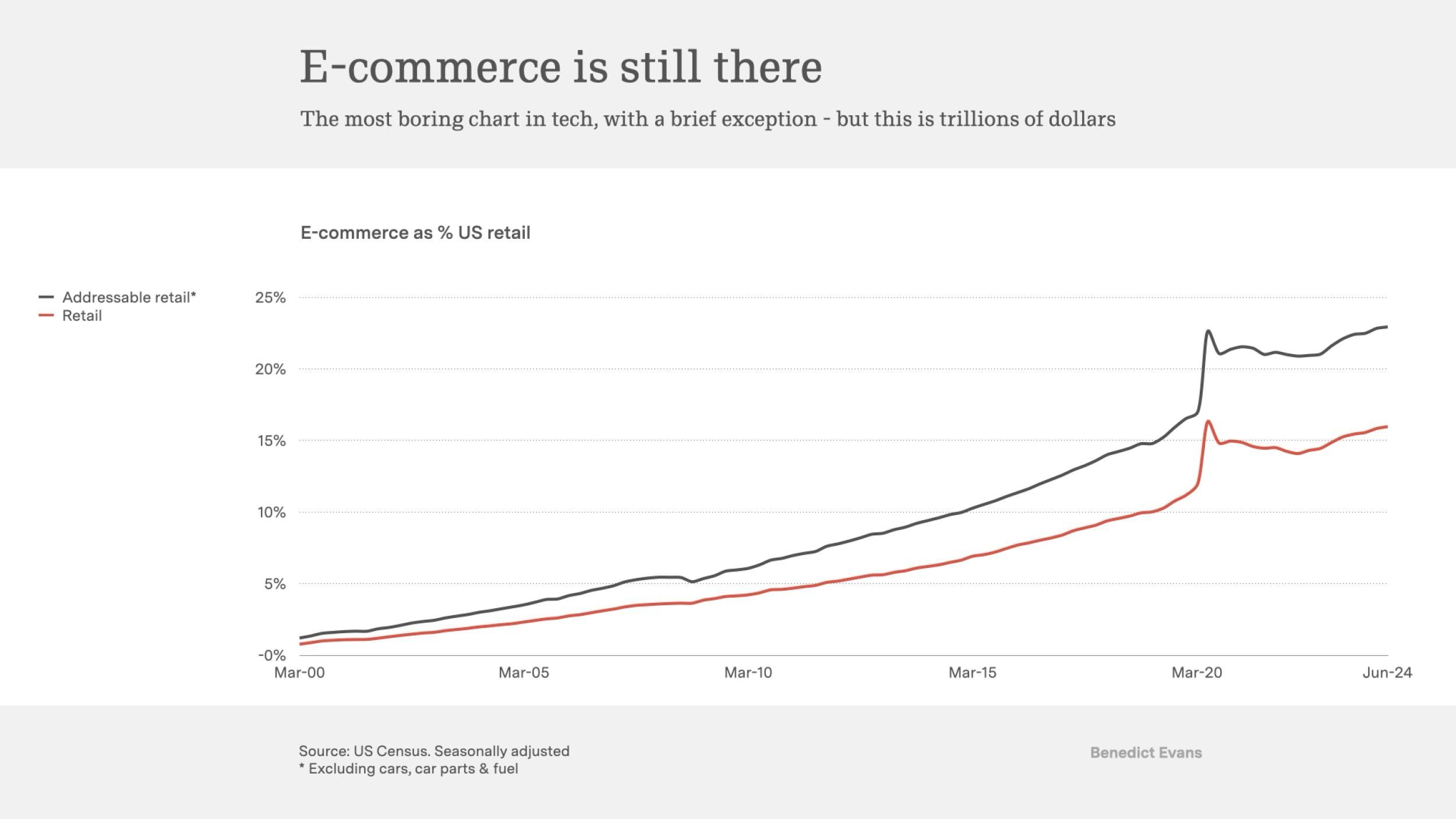 This chart of e-commerce is the most boring chart in the tech industry because it just went up one percentage point every year until we went through the pandemic, and then, of course it’s returned exactly back to the trend line that it was on before.