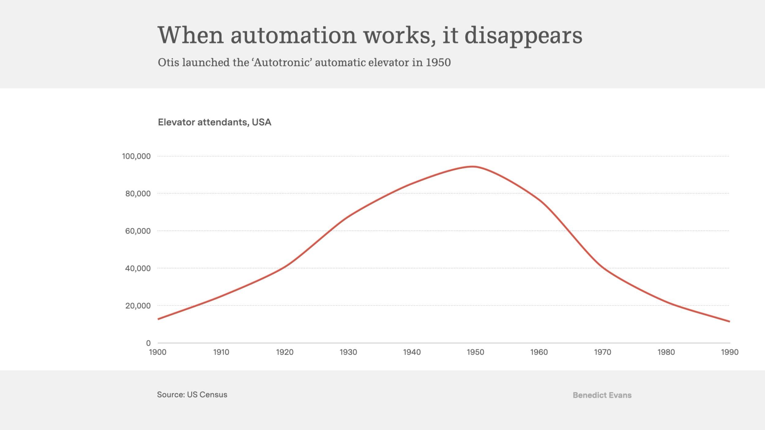 Elevator attendant was a job, as I mentioned earlier. Then, Otis deployed something called the Autotronic elevator, the automatic elevator. And then, of course, the chart went back down again. But how many of you, in the last couple of weeks, have used an automatic elevator? When you get into the elevator and you press the button, do you say, “Ooh, it’s an automatic one, it’s an electronic elevator”? We don’t say that anymore. “It’s an electronic elevator. It’s got buttons. There isn’t a man with an accelerator and a break.” When it works, it just disappears. We don’t see it anymore, it just becomes software. And we’re kind of going through that process now as we think, well, what do we do with this?