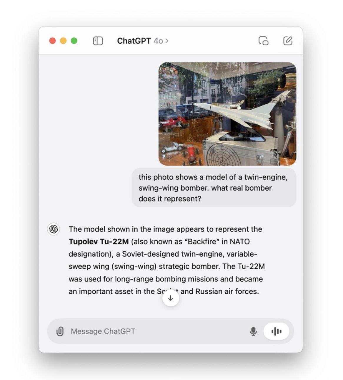 This is a photograph I took in an antique shop in Manhattan. I’m kind of a plane geek, and I couldn’t work out what aircraft it was. And here it is. I didn’t have a photograph of the actual aircraft. It’s a photograph of a model, and it’s never seen that model before, but it still worked out precisely which aircraft it was. It’s an early model of the Tu-22 that has a differently shaped engine intake. This is all very exciting. We’ve all seen demos of ChatGPT where you think, “Holy fucking shit, how did it do that? Computers can’t do that.”