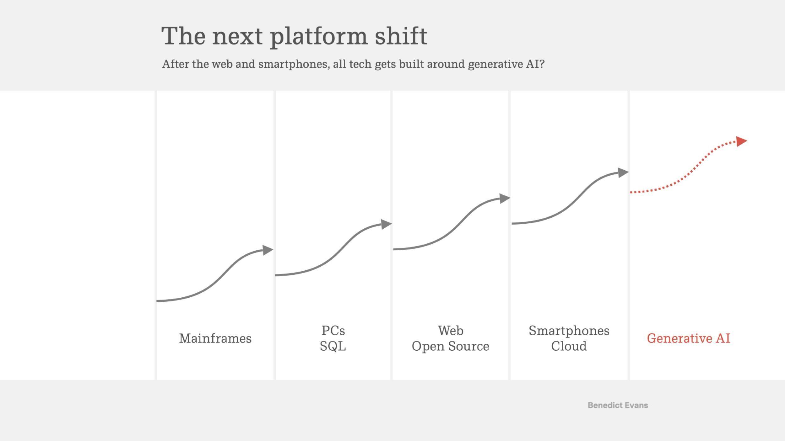 From the mid-1960s to the late 1970s, that was mainframes. Then, from the late seventies through to the mid-nineties, it was the PC, and then it was the web, and then smartphones. And now, we have another shift, almost certainly, due to generative AI.