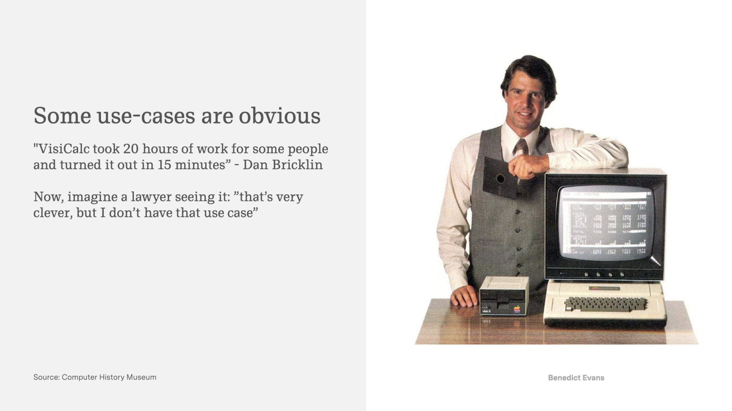 So, every now and then, in big companies, there’s somebody who downloads a bunch of data from their internal system, some horrible clunky legacy system like Salesforce, they get a CSV, put the CSV into Excel and make charts, put the charts into PowerPoint, make slides and email it around the company. And then somebody says, “Hey, maybe you should do this in Google Slides, and then you wouldn’t be emailing a file around.” And then somebody else says, “Yeah, but maybe our management system should just make the charts and maybe there should be an AI system that should just tell us what’s changed.” To begin with, you make the thing fit the new tool, and then the new tool means that you change how you do your job.