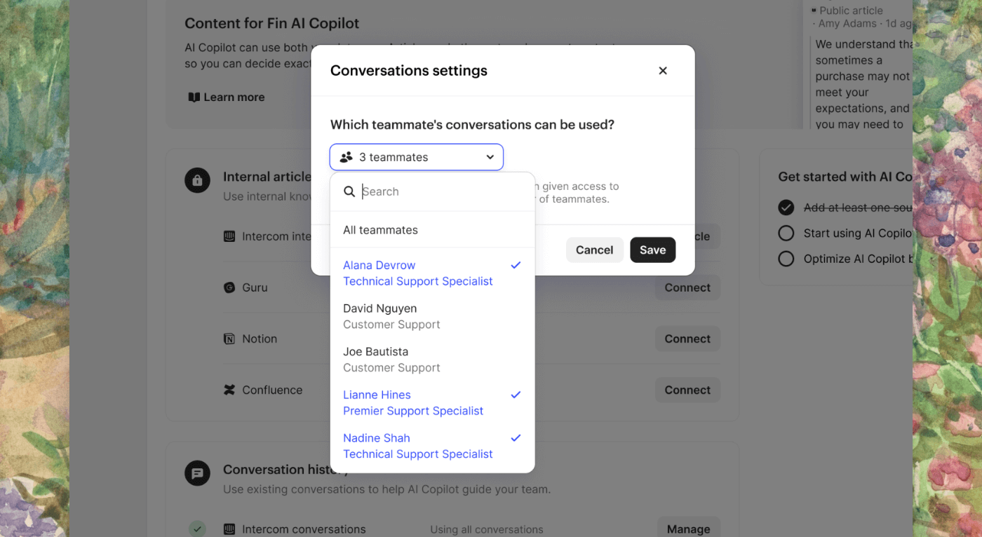 Fin AI Copilot can instantly learn from any of your agents’ past conversations. Conversation history will automatically be enabled so Fin can start answering questions right away. Plus, you can choose exactly which conversations are used, so Fin only learns from the best of your most experienced, knowledgeable agents.