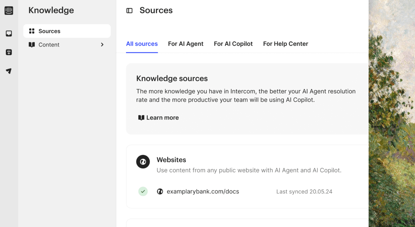 You can also configure content for AI Agent and your help center in the Knowledge Hub. And you can easily enable or disable content sources for Fin to use before saving.
