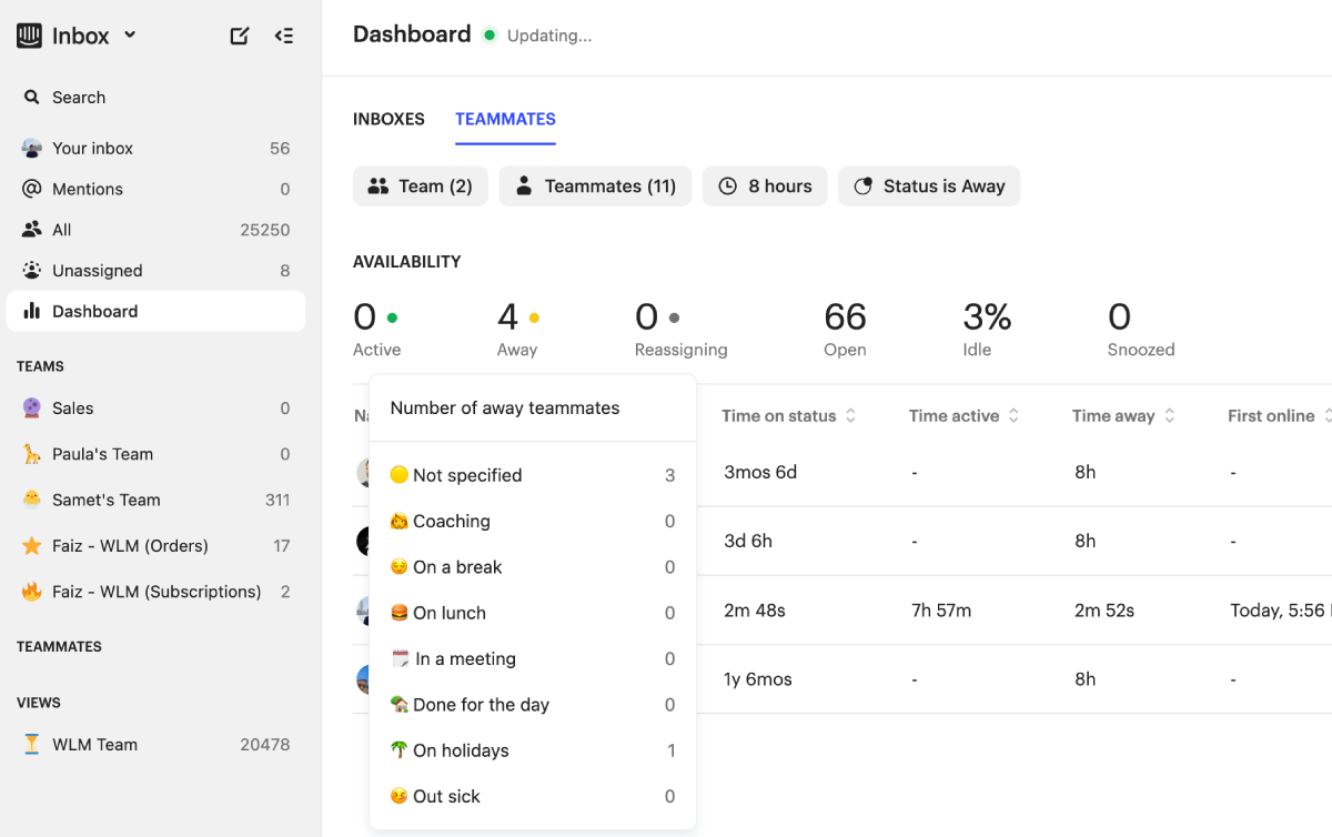 When managing a large number of teammates it can be hard to determine their reasons for being away at a glance. Now, the teammates tab in the real-time dashboard supports a breakdown by reason function to help you see this information instantly. Move your mouse over the “Away” or “Reassigning” text in the summary card to see the number of teammates per away reason. (Please note, this is only available in our next-generation Inbox.)