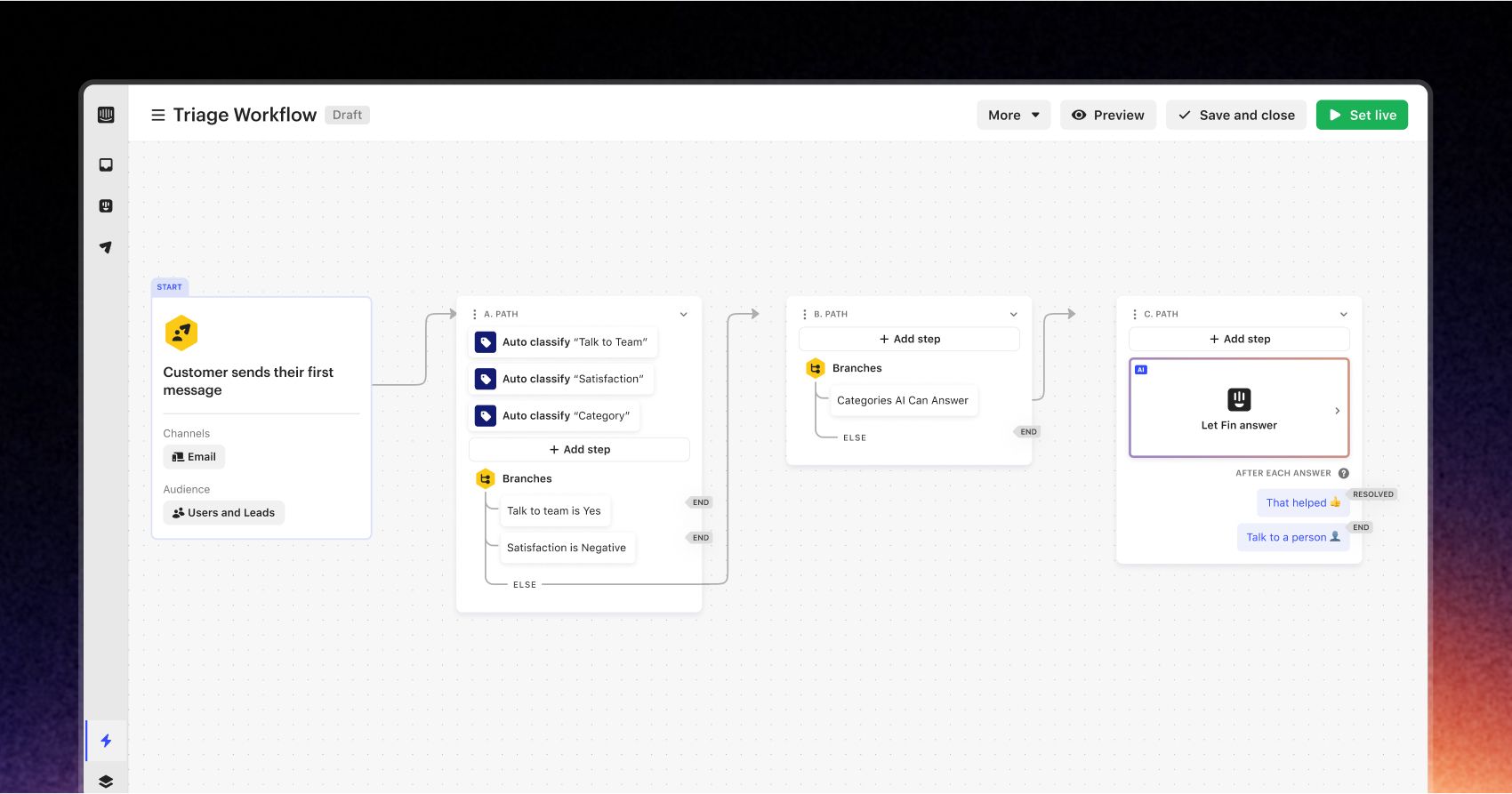 You can set all this up in our Workflows product. Our Workflows product is really easy to use, drag and drop, no code automation builder. You can give Fin hard rules in Workflows. You can give Fin guidance. For example, if a customer is angry, you can pass them to the special team that deals with all the angry people. If it’s a cancellation, you can pass it to the team that deals with cancellation requests. If it’s a feature request, you can tell Fin, “hey, can you file a ticket in Jira?” If it’s a bug, “can you file it in GitHub, but inform the right team about it?” You can set all these rules up. Any imaginable attribute, event, segment, region, channel, whatever. You can set it all up in Workflows.
