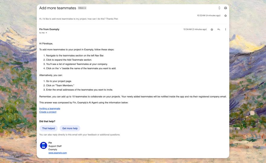 We’re constantly improving the capabilities of our Fin AI Agent so it can answer any type of customer question anywhere your customers ask them. This starts with making Fin multichannel, and we’re excited to announce that Fin over email is now available to everyone.