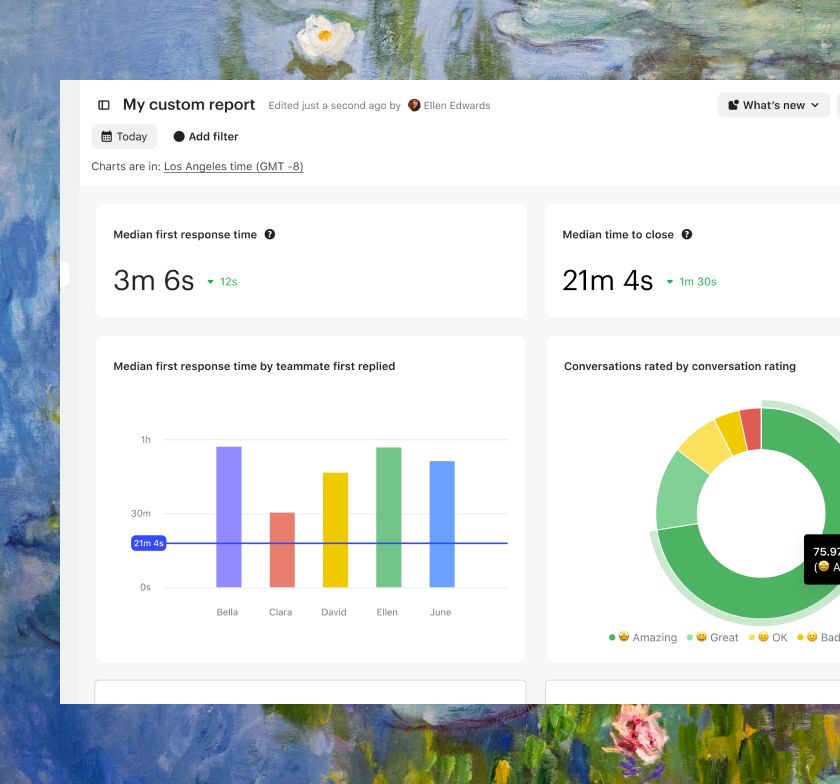 Most customer service leaders don’t have a full view of their support operation, often using an assortment of tools and spreadsheets to keep on top of metrics. Intercom Reporting delivers a holistic view of team performance.