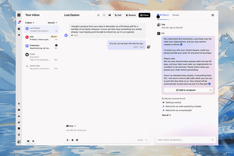 Let’s see Fin in action. Here, we have a customer conversation happening in the Intercom inbox, and you can see Fin is already ready to help in the right-hand panel. Looks like the customer needs help with a refund. Fin instantly understands the context of the conversation and has already suggested a question that the agent can ask.